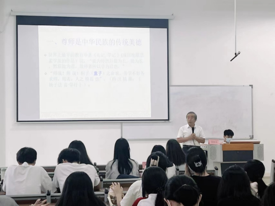 随后,李招忠院长认为,党和政府继承与发展了中华民族尊师的传统美德。他给同学们分享了我党历届领导人尊师的故事经历。毛泽东主席给恩师徐特立60岁寿辰时的致信祝贺;改革开放历史新时期,邓小平在教育界拨乱反正,力主恢复被文化大革命十年遭到损害的尊师重教之好传统;习近平总书记给初中恩师的充满感恩的回信,中共几代领导人用实际行动教诲我们要明白尊师的道理;改革开放以来,加强尊师教育立法,保障教师的各项权益,为中国的尊师制度提供了坚实的法律保障。