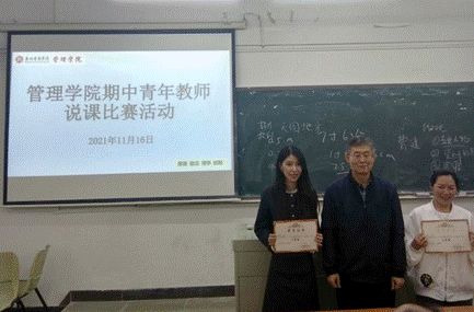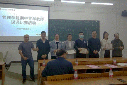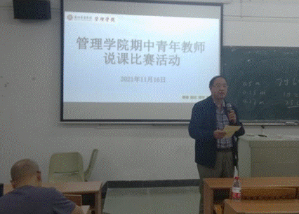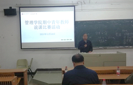 为了提升我院专任教师课堂教学质量,交流、分享我院教师在课程思政及现代教学手段应用方面的改革与创新成果,2021年11月16日下午,我院在励志楼C201举办了期中青年教师说课比赛活动。担任本次比赛的评委有:张干英副教授、严明副教授、工商管理系副主任韩波勇、市场学系副主任马航通、于金胜老师、贺嫦珍老师,全体老师也是大众评委。