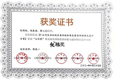 喜讯:我院师生参加第五届”云丰杯"物流设计大赛获优胜奖 太阳成集团tyc7111郭俊一老师指导陈锦聪、杨霖海和曹心兰3位学生参加第五届”云丰杯"全国绿色供应链与逆向物流设计大赛,进入决赛,最终获得优胜奖。 【关闭】