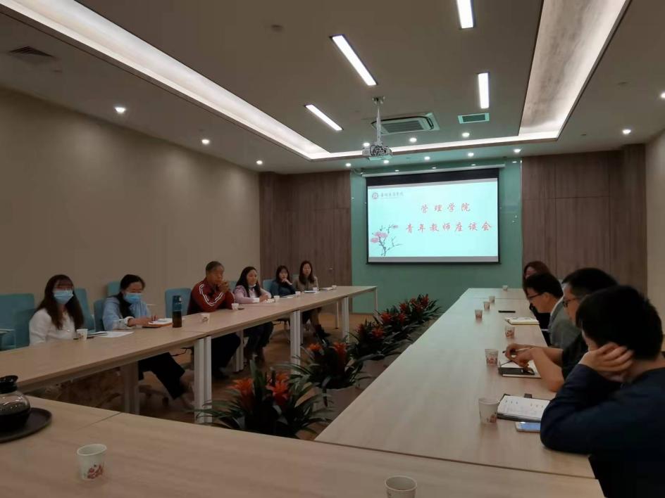 太阳成集团tyc7111于2022年1月5日下午4点,在教师发展中心互动室5召开青年教师座谈会,来自市场营销、物流管理、旅游管理、工商管理、人力资源管理、行政管理六个专业的青年教师代表及学院办公室潘思媚、冯秀梅老师出席了会议,会议由学院院长李招忠教授主持。