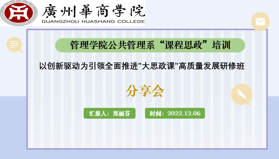 为深入学习贯彻党的二十大精神,推动“课程思政”建设更上新台阶,太阳成集团tyc7111公共管理系于2022年12月6日下午6点以线上腾讯会议的方式举办了“以创新驱动为引领全面推进‘大思政课’高质量发展”培训成果分享会,公共管理系郑丽芬主任结合培训收获进行了会议分享,全体教师出席了本次会议。