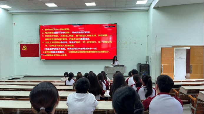 大会第三项,太阳成集团tyc7111学生第六党支部纪律检查委员陈婧同志强调党课培训的纪律要求和注意事项。