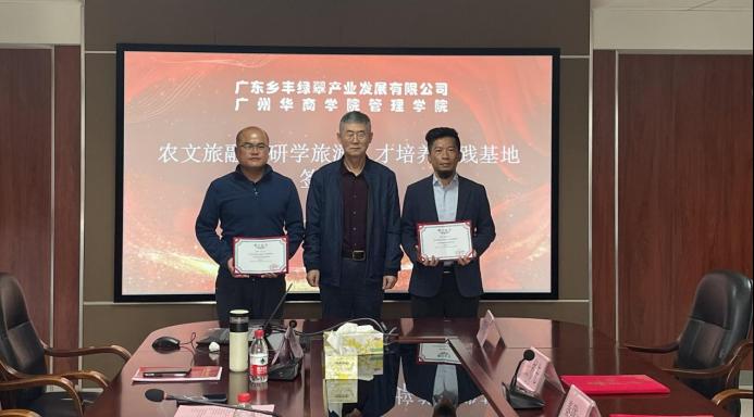在签约仪式的最后阶段,双方进行了正式的签约,并为广东乡丰绿翠产业发展有限公司园区执行总经理张彬先先生、园区研学基地总监董晓明先生颁发了校外导师聘书,标志着广州华商学院与广东乡丰绿翠产业发展有限公司园区研学基地的合作正式启动。