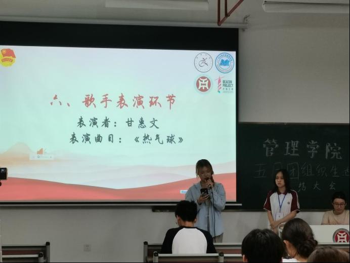 互动环节结束后,由歌手甘惠文同学为大家带来歌曲《热气球》,台上是散发着热情与光芒的朝阳,同学们不禁沉浸在甘同学温柔的歌声中,加入甘同学的合唱,现场的氛围由游戏时的活跃逐渐变成舒缓沉浸。