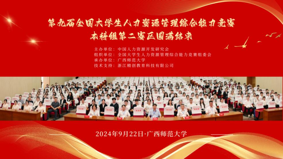 2024年9月22日,由中国人力资源开发研究会主办、广西师范大学承办、浙江精创教育科技有限公司技术支持的第九届全国大学生人力资源管理综合能力竞赛本科组第二区域赛完美落幕。第二赛区共有来自广东、广西、湖南、海南四大省市自治区190余支队伍参赛,70余支参赛队晋级线下“HR 职业实战”环节。
