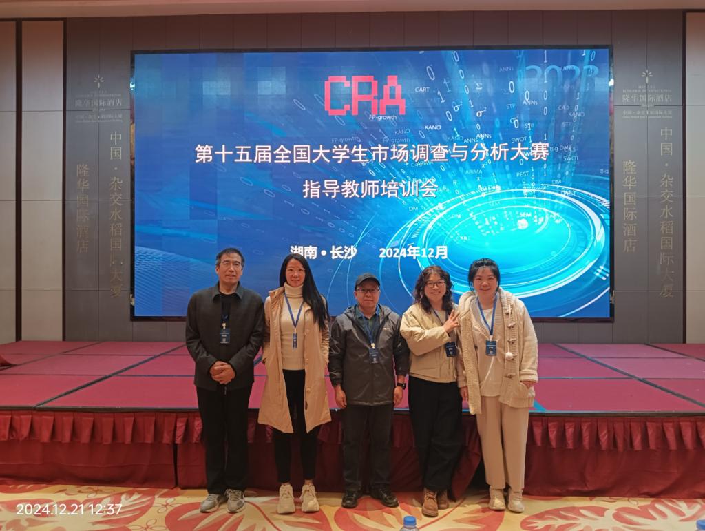 2024年12月21日,第十五届全国大学生市场调查与分析大赛指导教师培训会在湖南长沙隆重举行。太阳成集团tyc7111市场学系副主任马航通、副主任罗嘉欣、市场学系高环成教授、贺嫦珍副教授、张冰洁五位教师积极参会,与全国各高校指导教师们共同深入学习、交流探讨市场调查与分析领域的前沿知识与实践经验。