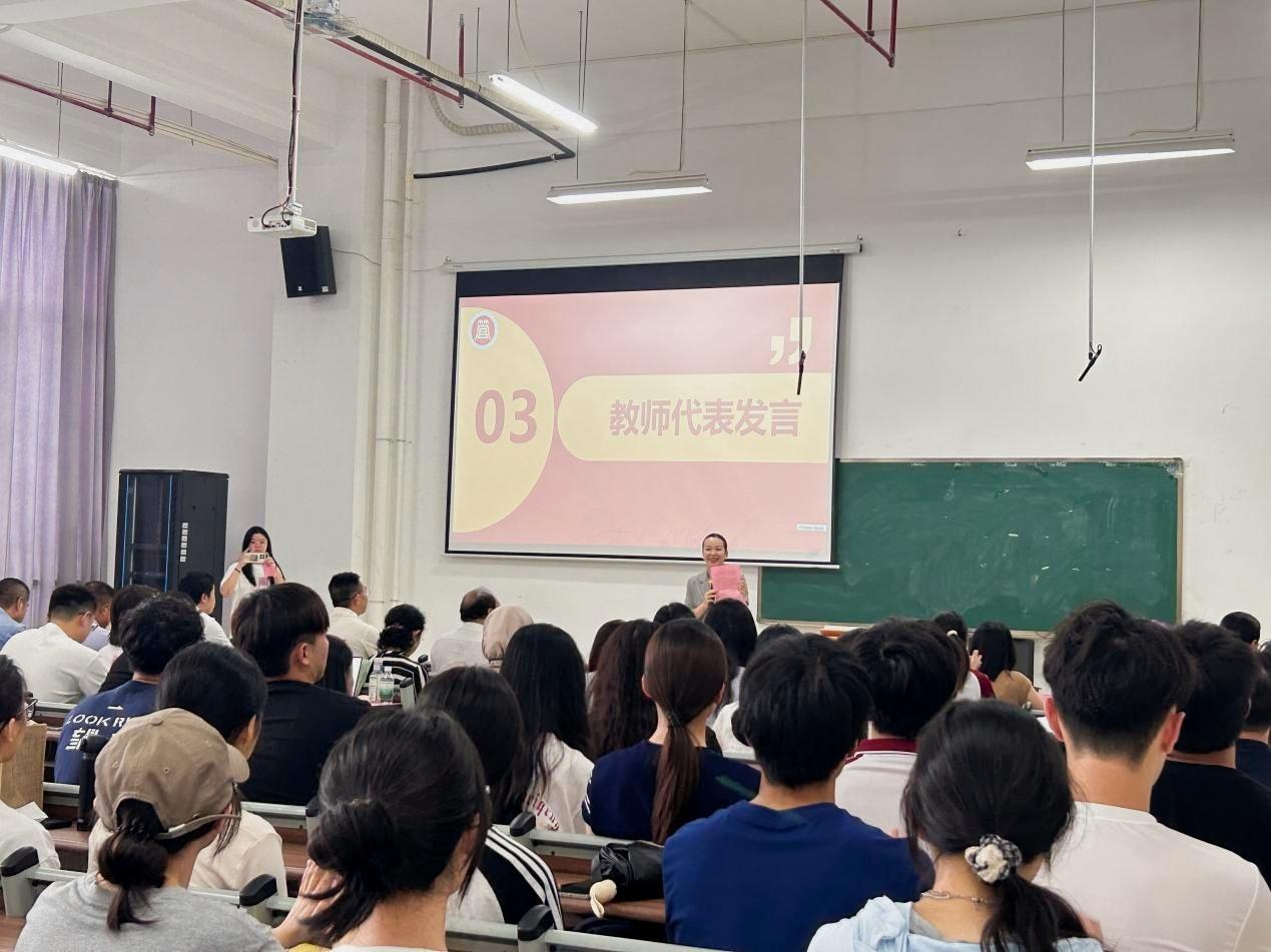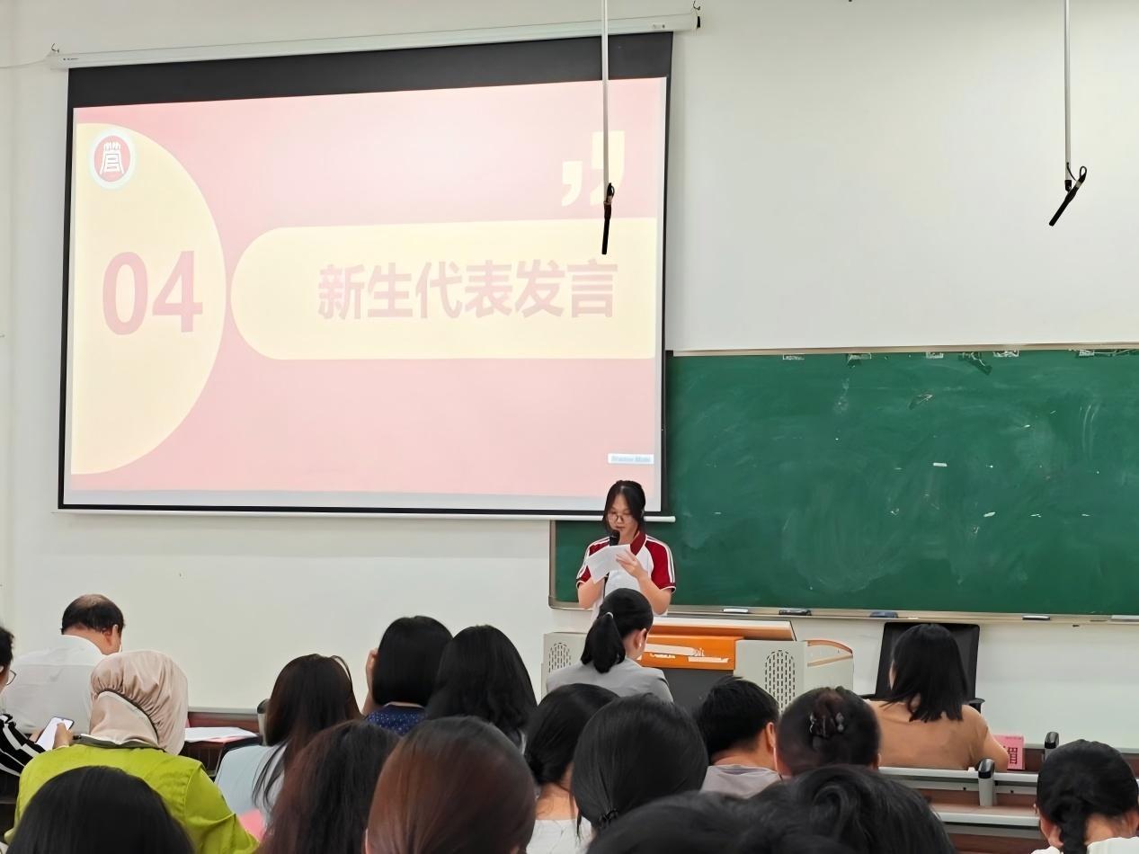 师生发言环节温情与力量并存。教师代表郑丽芬老师结合自身治学经历,从学习方法、职业规划等方面分享实用建议,叮嘱新生珍惜大学时光,脚踏实地提升自我;新生代表2025级行政管理班卢依然同学则以充满朝气的发言,表达了对大学生活的期待与憧憬,展现出2025级新生的活力与担当。