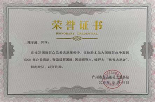 2025年,陈子威在社区安全宣传与关爱困难群众服务中成效显著。关爱困难群众时,他链接企业资源并成功为困难群众争取5000元公益资助;安全宣传中,他结合军旅经验提建议,守护居民平安。凭借用心服务,他在“微光筑安视频制作宣传小组”等等项目获“优秀志愿者”,每张证书均是时间与真心的见证。