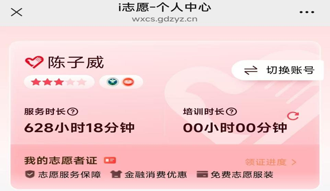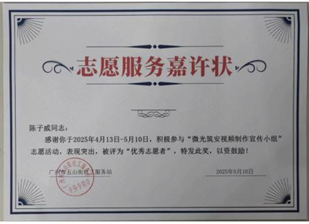 我院大学生退役士兵陈子威,第四次获“优秀志愿者”称号。他累计628小时志愿时长,安全宣传活动获天河区志愿者协会专题报道,以“退伍不褪色”诠释青春担当,彰显“管院精神”。我院为其骄傲,并致以诚挚感谢。
