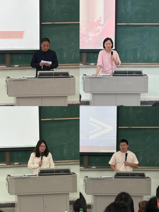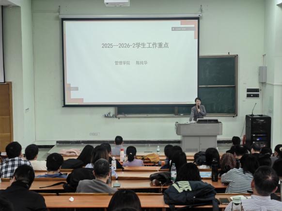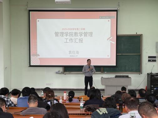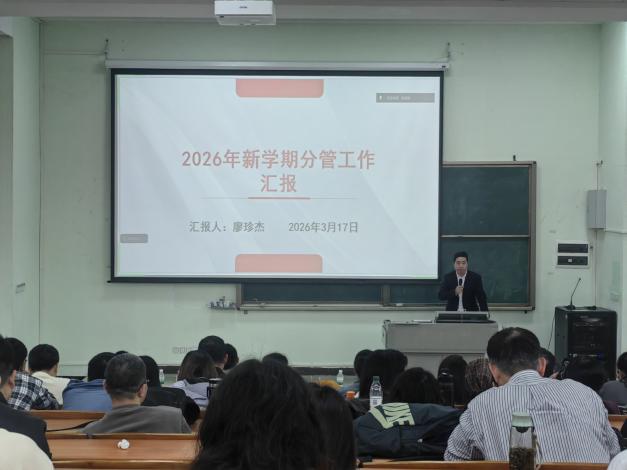 廖珍杰副院长从学科建设、科研工作、创新创业工作三方面作工作汇报。他回顾了学院2025年在学科规划、科研机构成立、论文发表、课题立项等方面的成绩,明确新学期将持续推进硕士点申报的调研与论证,并提出2026年“520工程”科研攻坚计划,鼓励教师申报各级课题、推动横向课题与专利立项;随后,廖院长肯定了学院双创工作取得的突破,并动员师生积极参与新学期双创竞赛,提升学院双创工作水平。