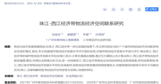 刘连花副教授师生共研团队取得了较大的成果,其与2017级学生叶琦琦,于2022年发表在科技核心期刊《数学的实践与认识》发表《珠江-西江经济带物流经济空间联系研究》,文章研究珠江-西江经济带区内的11个城市的物流经济空间联系特征及组织模式,研究结果表明,珠江-西江经济带物流经济发展水平存在区域差异;其物流经济联系整体网络密度较大,但是网络结构联系中存在不均衡的状况,核心-边缘现象明显;物流经济空间呈现为双核心发展的特征,文章为促进珠江-西江经济带物流一体化发展提供了科学依据。