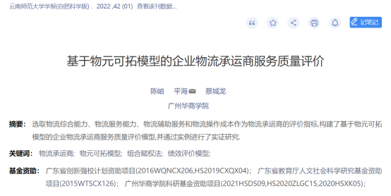 陈岫副教授的师生共研团队经过师生的共同努力,其与2017级学生蔡城龙合作,于2022年发表在科技核心期刊《云南师范大学学报(自然科学版)》发表《基于物元可拓模型的企业物流承运商服务质量评价》的论文。文章选取物流综合能力、物流服务能力、物流辅助服务和物流操作成本作为物流承运商的评价指标,构建了基于物元可拓模型的企业物流承运商服务质量评价模型,并通过实例进行了实证研究,为企业选择物流承运商提供借鉴。