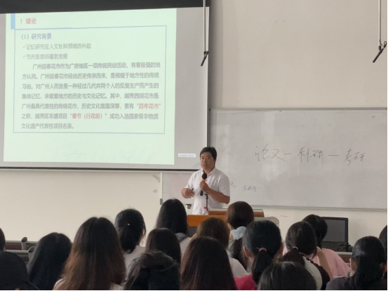 讲座伊始,廖教授与大家进行互动,并用自己的经历向大家介绍广州一年一度的迎春花市活动,就此拉开了讲座序幕。在正式开始今天的主题讲座前,廖教授依托自己专业的学科知识为大家构建起基本的论文研究体系,如:选择研究的案例是案例研究中的第一步,需要根据研究的目的和问题,选择具有代表性和典型性的案例地。廖教授对广州迎春花市有着非同一般的情怀,他指出广州迎春花市在珠三角地区有着广泛的影响力,其规模之浩大,历史之悠久,非常值得研究和探索。