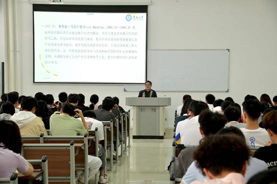 讲座前,同学们以热烈的掌声欢迎杨教授的到来。讲座伊始,杨教授用通俗易懂的话语向同学们介绍了数字经济的概念特征,并指出以数字信息作为关键生产要素的数字经济将持续推动经济社会数字化转型、助推经济社会发展变革、加速重构经济发展与治理模式,已经成为学术界和各国政要的共识。同时他也指出我国数字经济在快速发展的同时也面临着一些问题:传统产业数字化转型缓慢、各国日益重视隐私信息的保护、产业发展不均衡、互联网平台的违规操作等方面带来的挑战。基于此,未来数字经济将朝“数字产业化、产业数字化”的方向发展,在促进消费数字化、投资数字化、贸易数字化以及服务的可贸易性,转变企业资产结构,提高政府治理效能,改变城市治理方式等方面赋能经济社会高质量发展。