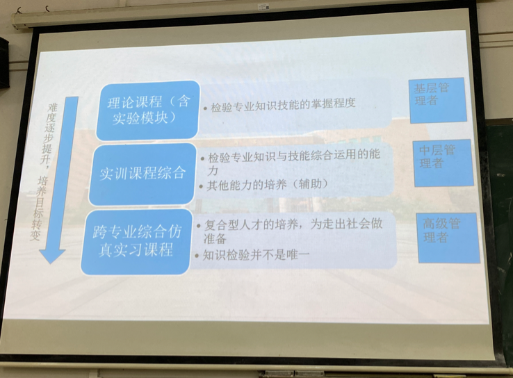 此部分,吴主任总结出理论课程(含实验课时)、实训课程和跨专业综合仿真实习课程是阶梯式实验学习,也要求学生像不同阶层管理者一样在不同的实训课程中提升不同的能力,如理论课程(含实验课时),更专注于技术技能的培养,而跨专业综合仿真实习课程更专注于概念技能的培养等。