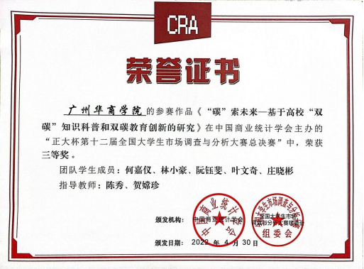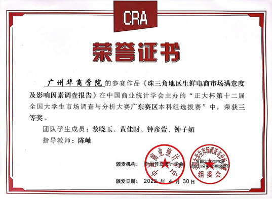 喜讯!华商学子在“正大杯第十二届大学生市场调查与分析大赛广东赛区本科组选拔赛”中荣获三等奖