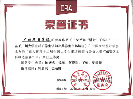 团队学生成员:陈智杰、戈奥、何晓筠、王恒、梁瑞麟的参赛作品《“今天你“惜命”了吗?”--基于广州大学生对于养生认知及其养生市场调研》荣获三等奖。