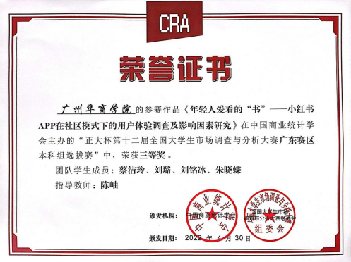 团队学生成员:蔡洁玲、刘璐、刘铭冰、朱晓蝶的作品《年轻人爱看的书--小红书APP在社区模式下的用户体验调查及影响因素研究》荣获三等奖。