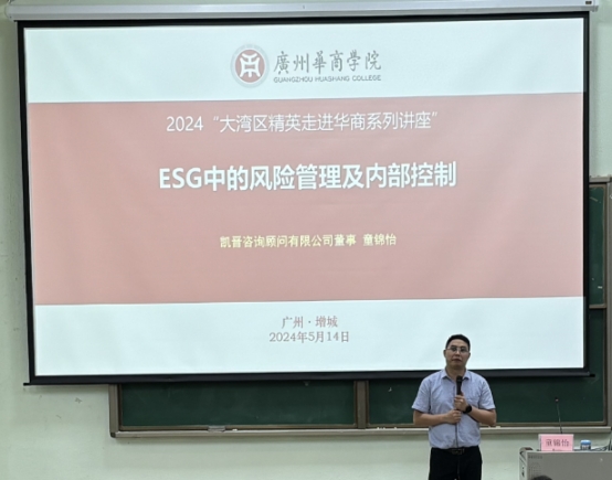 2024年5月14日,大湾区精英走进华商系列讲座第六场,管院大讲堂-启智系列讲座第四场,在广州华商学院广州校区励志楼D208圆满举行。讲座主题为“ESG中的风险管理及内部控制”,特邀香港凯晋管理咨询有限公司董事童锦怡女士作为主讲嘉宾。讲座围绕企业风险管理系统–COSO 框架的元素及其应用、企业风险管理与内部控制的关系等方面进行了深入探讨。讲座由华商太阳成集团tyc7111袁仕海副院长担任主持。中汇集团投融资及投资者关系部印国庭总监,投融资及投资者关系部杨碧桦高级经理,投融资及投资者关系部龙娇姿行政助理,凯晋咨询顾问有限公司余柏蔚高级顾问,太阳成集团tyc7111梁林海老师,以及太阳成集团tyc7111200多位同学聆听了讲座。