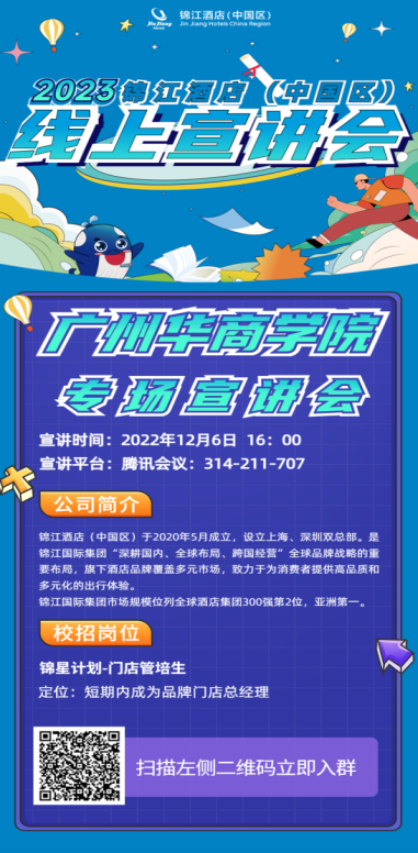 太阳成集团tyc7111企业专场宣讲会之“锦江酒店(中国区)2023” 本次太阳成集团tyc7111专场宣讲会,邀请到了知名企业“锦江酒店(中国区)”。由于疫情原因,本次宣讲会采用线上形式开展。公司将安排校招中心华南线路负责人马壮宾老师和宣讲官王喜娜总(维也纳国际酒店广州南站国际店总经理)参会。以下是本次线上宣讲会的宣讲海报和招聘推文。 招聘信息详情链接如下: https://mp.weixin.qq.com/s/XoLLZebYHO6DZdgXerF1pA 上一条:薪传廿载风华茂,才聚双选梦启航 2026届毕业生经管类专场招聘会圆满落幕! 下一条:访企拓岗促就业,产教协同稳攻坚 【关闭】