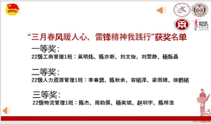 活动二“三月春风暖人心,雷锋精神我践行”的一等奖是莫明炜、陈亦新、刘文怡、刘雯静、杨烁晶;二等奖李春贤、陈秋余、容铭泽、梁雨晴、徐鹤鸣;三等奖陈杰、周韵展、杨奕斌、赵圳宇、陈梓浩。