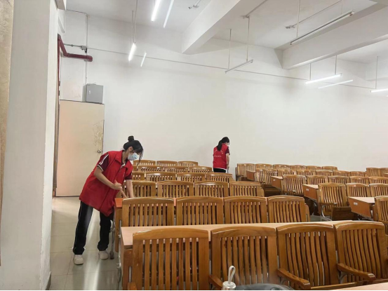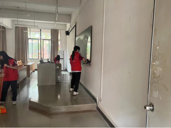 志愿者们主要对教室的地面、桌椅、黑板进行清洁打扫。大家对工作认真负责、配合默契,将教室的每个角落都打扫得干干净净。