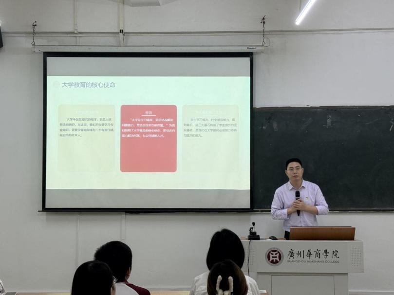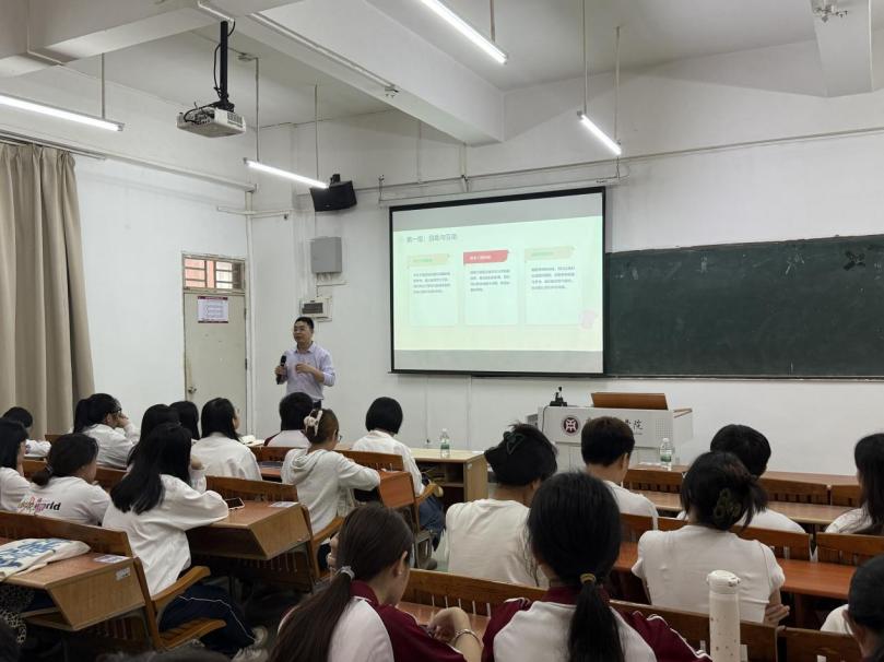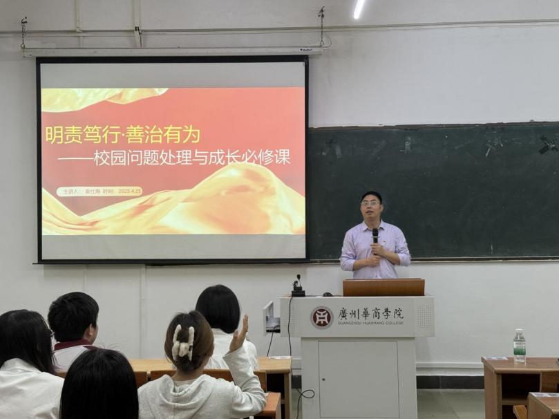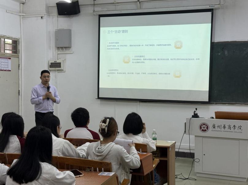在授课的过程中,袁仕海书记针对学业类常见问题,如学术申诉、宿舍矛盾、心理健康等,进行了细致解读,并提出了 “三级路径” 解决思路。第一级是自助与互助,学生可借助查阅学生手册、寻求班级干部协调或朋辈导师支持等方式,初步尝试解决问题;第二级是借助学院资源,通过与辅导员沟通、向系主任反馈、获取教学秘书协助,进一步探寻解决方案;第三级则是依靠校级申诉机制,切实保障自身合法权益。