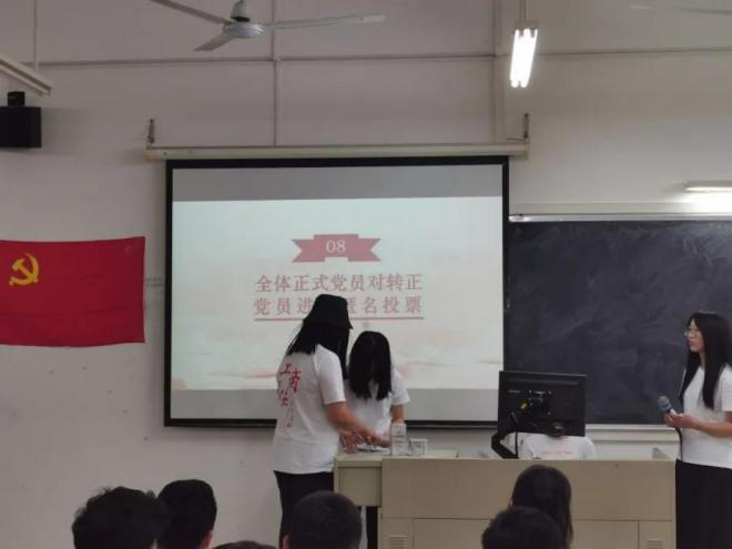 全体正式党员在本着公平、公正的立场对18、19期预备党员进行匿名投票。最终,全体党员同志均同意黄馨文、陈佳娜等9名同志的转正申请。18、19期的预备党员同志如期转正,成为一名光荣的正式党员。