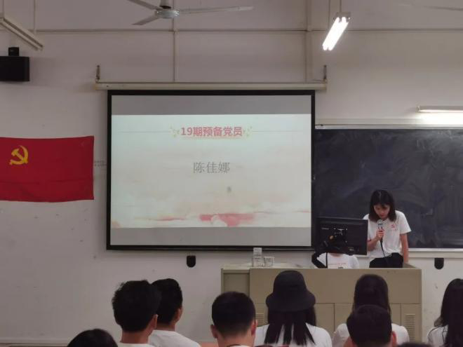 接下来由19期预备党员陈佳娜等7名同志依次上台宣读转正申请书,预备党员同志认真地宣读转正申请书,表明他们对党的忠诚与热爱。