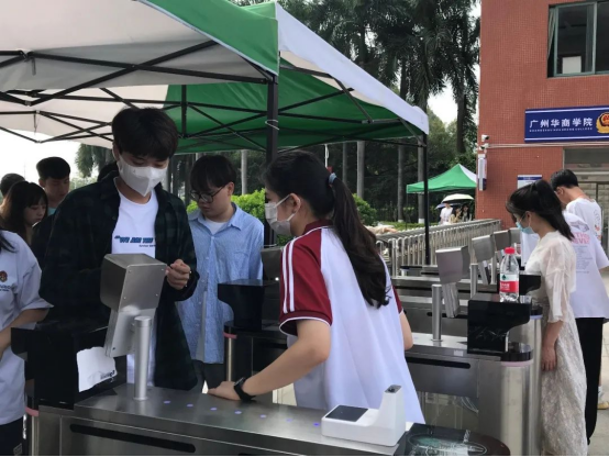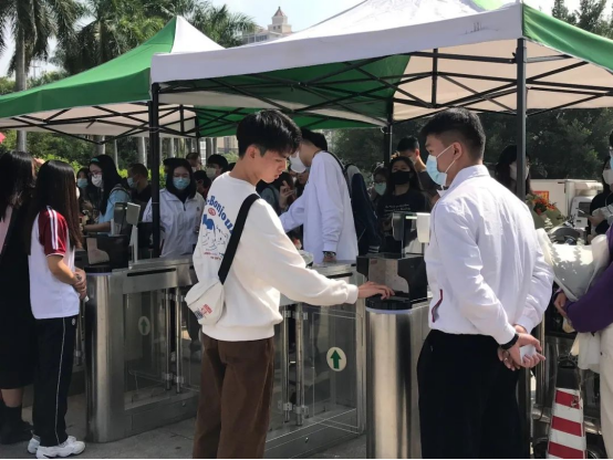 值班期间,测量体温的志愿者们分工明确,对返校的同学进行体温测量、粤康码检查、行程卡检查等工作并维持进校秩序,引导每一位返校学生顺利入校。返校的学生们在工作人员的指引下,有条不紊、井然有序地踏入了校门。此次疫情防控工作的部署让同学们的人身安全得到了极大的保障。