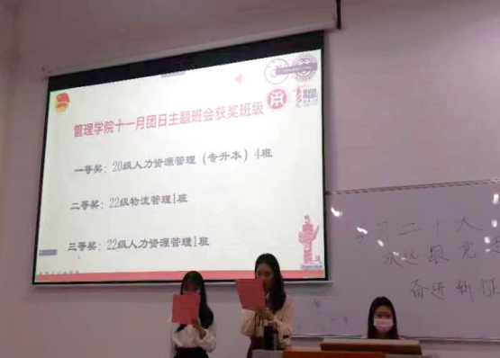 歌曲演唱完毕,大会进行到颁奖环节。在十一月团生获得的活动一“凝心聚力新时代,团结奋斗新征程”中,获得一等奖的班级是20级人力资源管理(专升本)4班;获得二等奖的班级是22级物流管理1班;获得三等奖的班级是22级人力资源管理1班