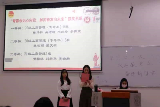 在十一月团生活动的活动三“青春永远心向党,踔厉奋发向未来”中,获得一等奖有:20级工商管理(专升本)5班的徐泽锋、吴诗琦、玲玲、余桐欣四位同学;获得二等奖的有:20级工商管理(专升本)5班的魏秋丽、蔺天祺两位同学;获得三等奖的有:21级工商管理1班的黄桦琳、刘裕华、吴映君三位同学。