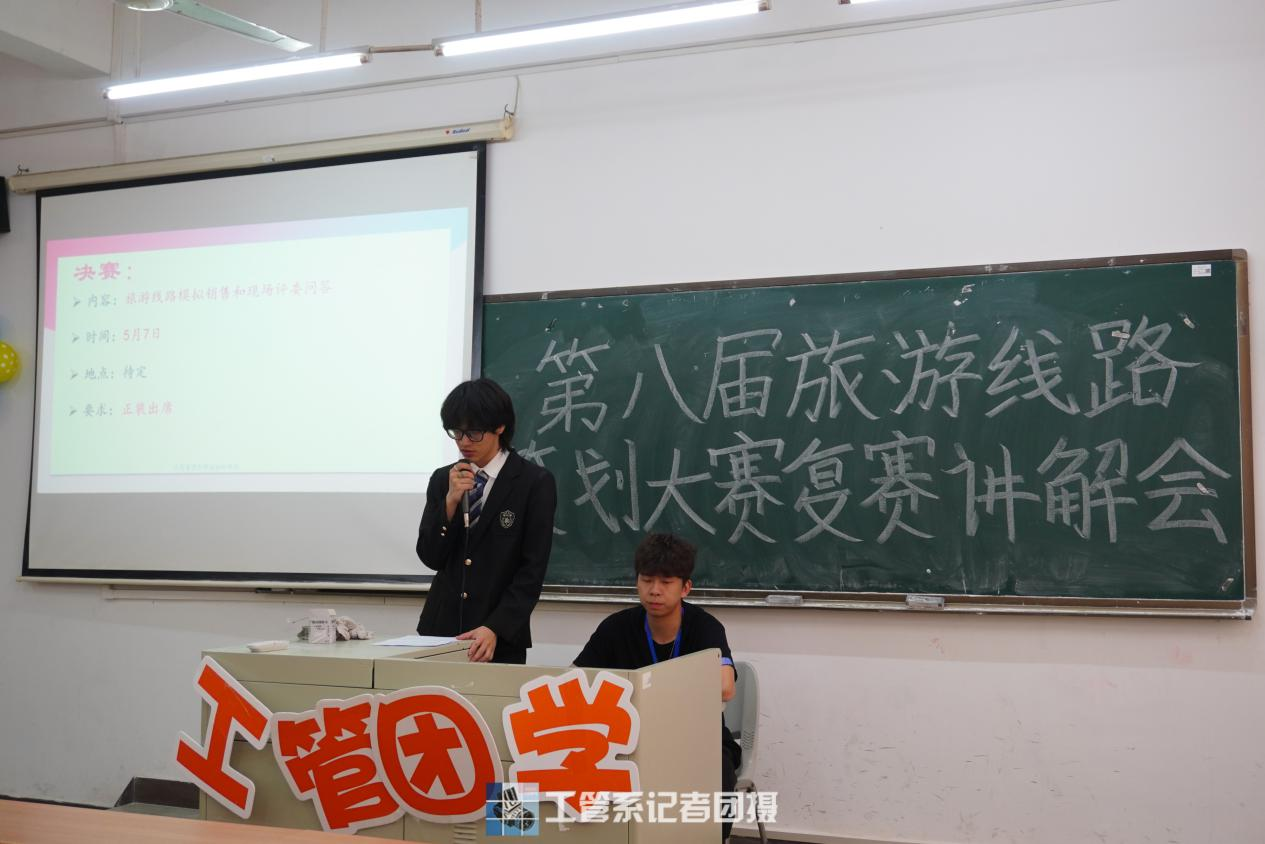 紧接着,由工管系团总支学生会秘书处干事黄泽鑫为选手们讲解了本次旅游线路策划大赛复赛的相关内容。他讲到了选手们需在4月14日前上交ppt,在4月17日前上交视频材料。他讲到了复赛将于4月20日正式举行,分为两个环节:得分占复赛总分80%的路线讲解与得分占复赛总分20%的“讲好红色故事”,最后由评委老师为各小组进行评分。他还讲到了本次复赛的得分将占本次大赛总分的40%,折算后总分得分最高的6个小组将晋级决赛。