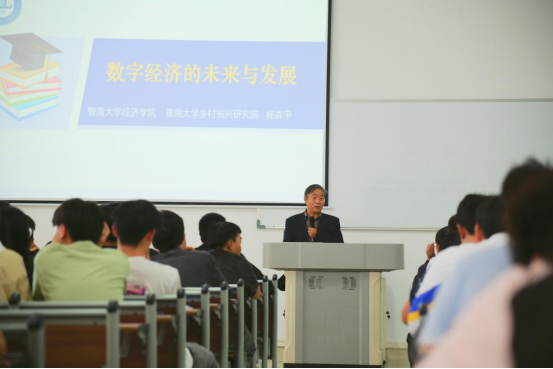 讲座开始前,同学们以热烈的掌声欢迎杨教授的到来。会议伊始,杨教授用通俗易懂的话语向同学们介绍了数字经济的概念特征,并指出以数字信息作为关键生产要素的数字经济将持续推动经济社会数字化转型、助推经济社会发展变革、加速重构经济发展与治理模式,已经成为学术界和各国政府的共识。同时他也指出我国数字经济在快速发展的同时也面临着一些问题:传统产业数字化转型缓慢、各国日益重视隐私信息的保护、产业发展不均衡、互联网平台的违规操作等方面带来的挑战。基于此,未来数字经济将朝“数字产业化、产业数字化”的方向发展,在促进消费数字化、投资数字化、贸易数字化以及服务的可贸易性,转变企业资产结构,提高政府治理效能,改变城市治理方式等方面赋能经济社会高质量发展。