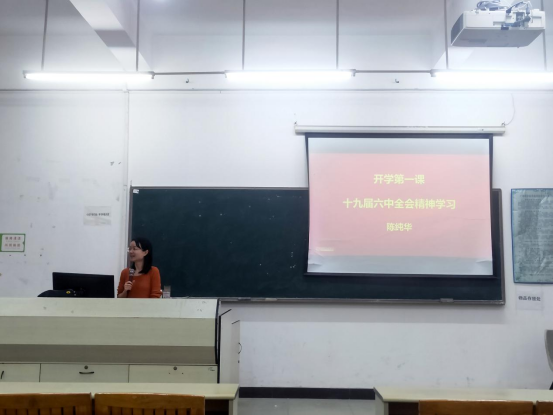 课上,陈纯华老师紧紧围绕“十九届六中全会精神学习”的主题,从十九届六中全会精神的主要内容、中国共产党的百年奋斗之路、砥砺奋进,开创未来三方面,对党的十九届六中全会精神作了全面、深入解读,对我院学生进一步学习贯彻党的十九届六中全会精神具有指导作用。
