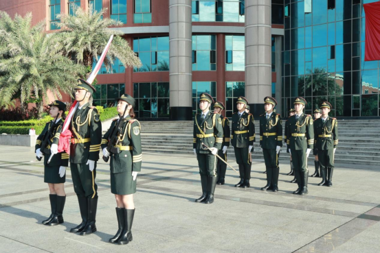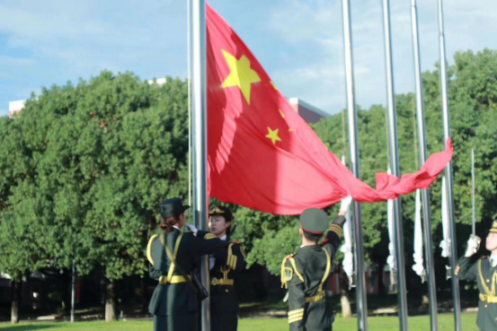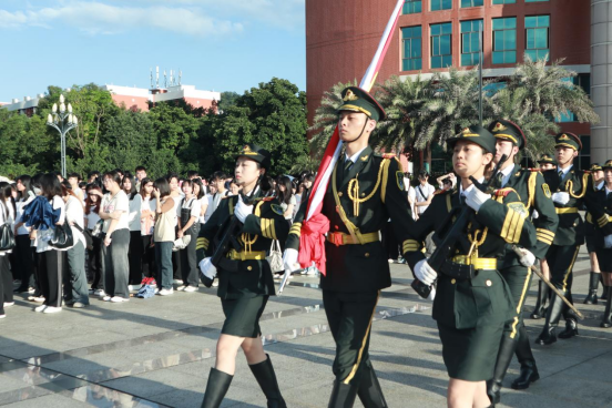 典礼伊始,广州华商学院国旗护卫队护送着鲜红的国旗,全体师生共唱国歌,国旗徐徐升起,开学典礼在神圣庄严的升旗仪式中缓缓拉开序幕。