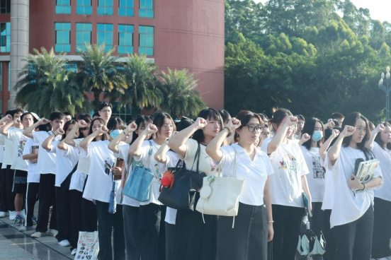 最后,大会进行学生集体宣誓,新生们铿锵有力的声音在空旷的中央图书馆广场上响起,且坚定的喊出华商校训,至此毕业典礼结束。