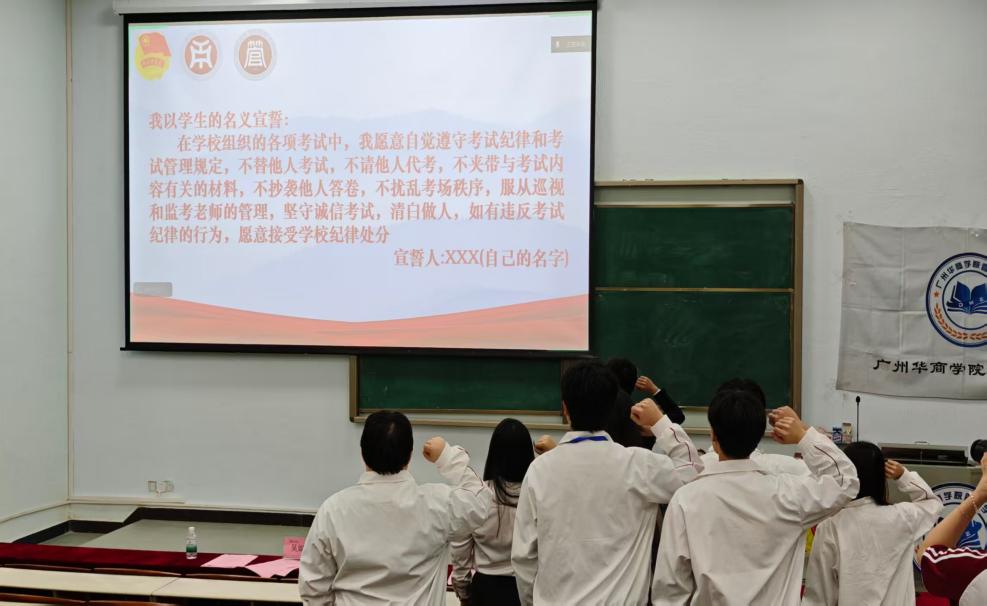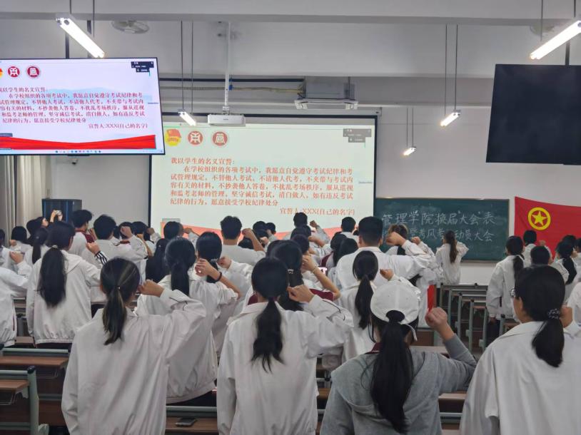 大会最后,全体与会同学在主持人的带领下,起立并庄严宣读《考风考纪诚信承诺书》。铿锵有力的誓言回荡在会场,表达了同学们严守考纪、诚信应考的坚定决心。宣誓完毕后,同学们有序签署承诺书,以实际行动践行诺言。