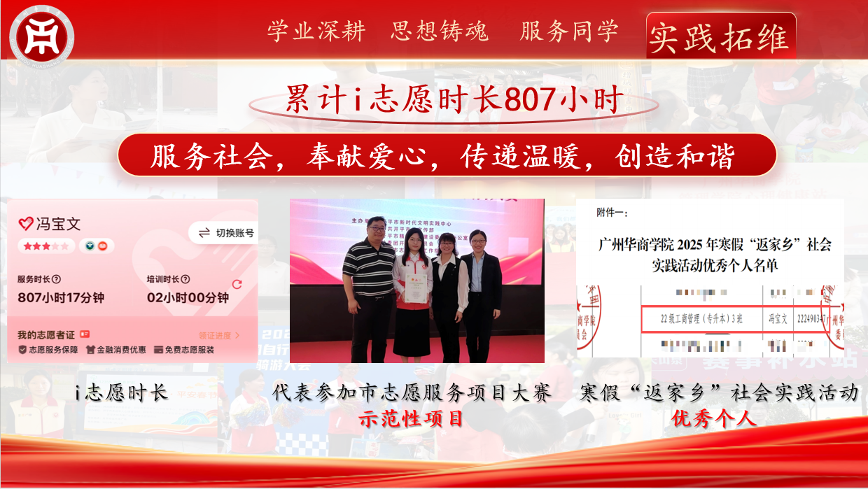 积极发挥先锋模范作用,参与2次无偿献血,并投身于2024中国自行车运动骑游大会、2025粤港澳大湾区女子半程马拉松等多项志愿服务,累计服务时长807个小时;