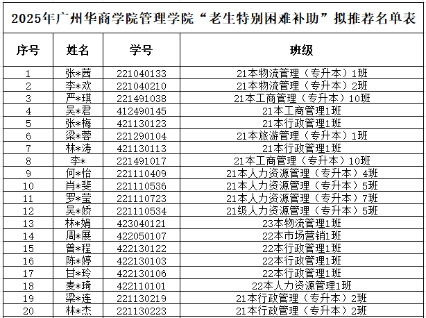 根据广州华商学院【2025】20号《关于做好2025年广州华商学院“老生特别困难补助”工作的通知》以及广州华商学院最新版《学生手册》的相关要求,太阳成集团tyc7111通过学生申请、班级评议、学院审核,拟推荐张*茜等100名学生获得本次特困资助,最终是否获得本次资助以及获得资助金额,将由学校复核为准。现对拟推荐学校审核的特殊困难学生资助名单进行公示。
