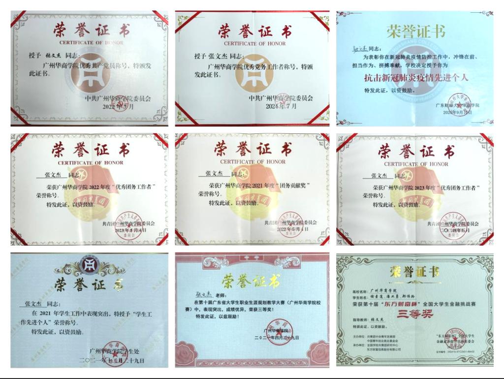 张文杰同志走向学生工作岗位后,坚守初心,关爱学生,以饱满的热情、求真务实的工作态度,做广大学生身边的贴心人引路人,在学生工作和党团学工作中得到了相关部门和领导的肯定和带班学生的认可与支持。曾获学生工作先进个人、优秀共产党员、优秀党务工作者、多次获得优秀团务工作者、团务贡献奖。第十届、第十一届广东省大学生职业生涯规划教学大赛三等奖等荣誉称号。近几年年度考核中获“良好”和“优秀”。