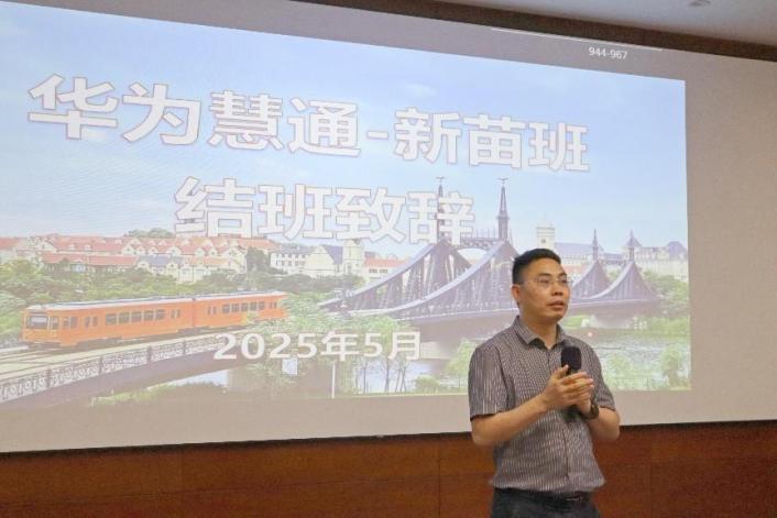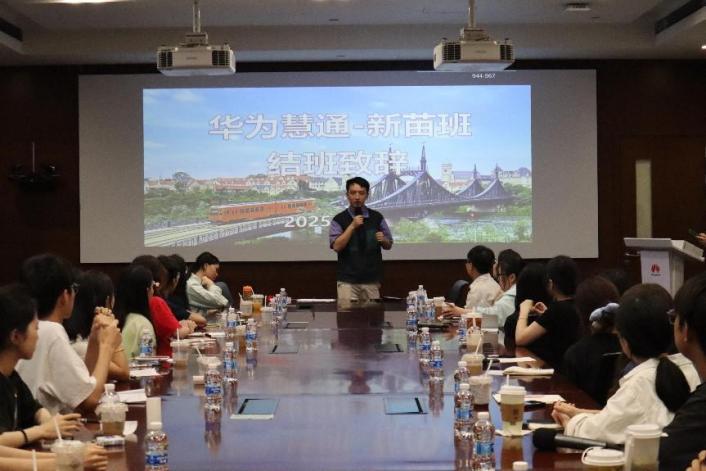 授课结束后,迎来了新苗班的结班及Co-op项目启动仪式,作为校方代表,太阳成集团tyc7111党委书记兼副院长、人力资源产业学院执行院长袁仕海副教授进行了致辞,他指出此次青苗班的开设对太阳成集团tyc7111而言,不仅是一次产教融合的典范实践,更是启动Co-op项目革新人才培养的关键之举。通过与华为慧通商务有限公司的合作,学院得以将企业真实的商务运营场景、前沿的管理理念和数字化商务技术引入课堂,推动课程体系的迭代升级,同时袁仕海书记也对新苗班同学的表现表示高度赞赏,他指出此次结课是大家职业征程的新起点,需以“长板效应”强化团队协作,在实践中验证理论,在创新中追求卓越。