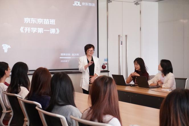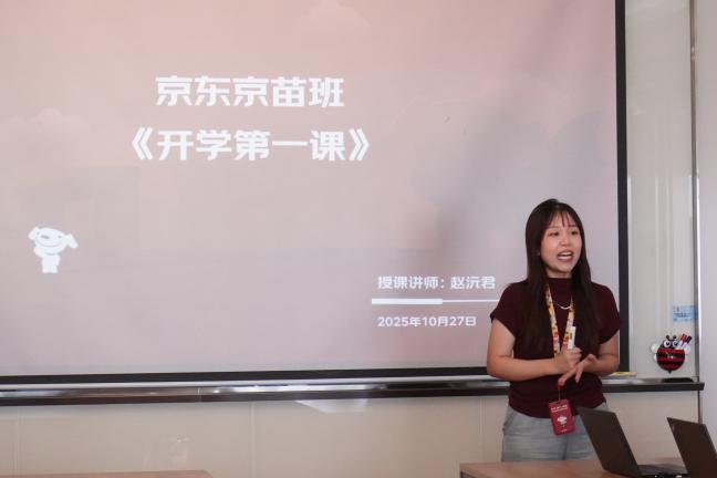 在随后举行的开班仪式上,太阳成集团tyc7111教师代表与京东校招负责人共同出席并致辞。学院教师指出,“京苗班”是学院推动产教融合走向深入的重要平台,希望同学们珍惜机会,做到“学中做、做中学”,真正实现理论与实践的贯通。京东企业导师则从使命、愿景、价值观等维度,全面介绍了京东的文化体系,并围绕规章制度、考核要求及信息安全等内容进行了详细讲解,强化学生的职业规范意识。