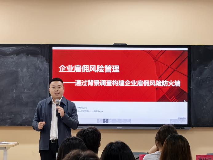 随后,刘阳副院长带来企业雇佣风险管理主题演讲。他从背景调查的定义、发展历程切入,结合政策导向与行业数据,深入剖析雇佣风险产生的核心原因,分享行业真实案例与背调实操要点,让现场师生对智能背调与人才风险管控领域的行业现状、职业要求形成了系统且深入的认知。